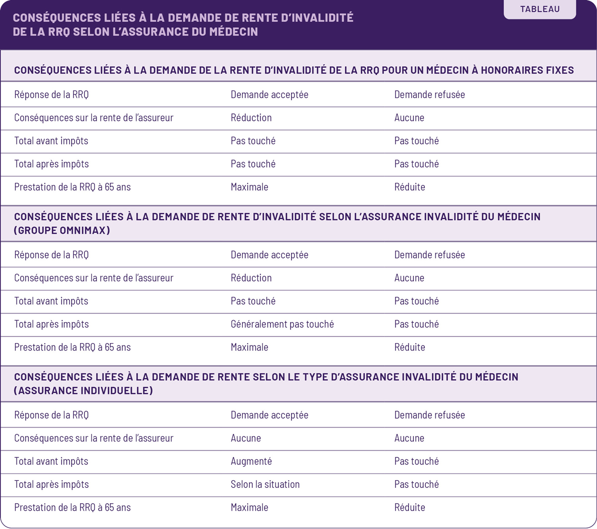 Selon sa situation, depuis les modifications législatives récentes touchant le calcul de la rente versée par la Régie des rentes, il peut être dans l’intérêt du médecin de faire une demande de rente d’invalidité auprès de cet organisme dans le but de maximiser le montant de la rente qu’elle versera lorsque le médecin arrivera à 65 ans. Avant de prendre des décisions impulsives, il peut valoir la peine de consulter un conseiller financier pour s’assurer de tenir compte de potentiels angles morts selon la situation individuelle du médecin. Il ne faut pas supposer que c’est désavantageux.