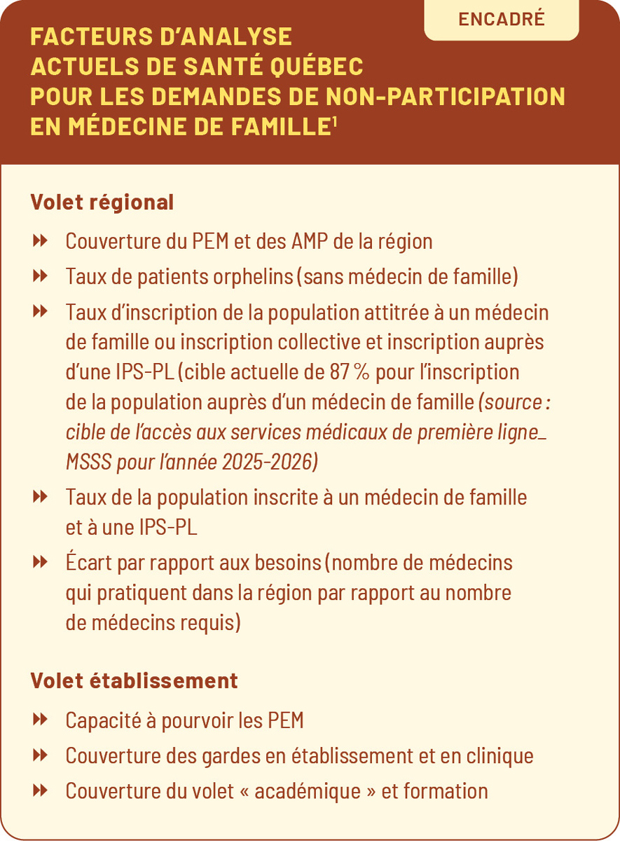 Comme nous l’avons mentionné précédemment, Santé Québec doit tenir compte des orientations déterminées par le ministre et de tout facteur qu’elle juge pertinent. Ses décisions sont discrétionnaires et doivent s’appuyer notamment sur les critères prévus à la Loi énumérés précédemment. Plus précisément, Santé Québec a informé la FMOQ qu’elle utilise actuellement les facteurs d’analyse indiqués dans l’encadré pour les demandes de non-participation en médecine de famille (à jour au 1er août 2025)1.