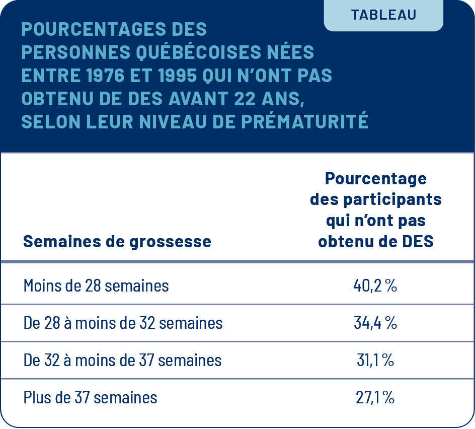 En général, les enfants extrêmement prématurés ont plus de risques de ne pas obtenir un diplôme d’études secondaires que ceux nés à terme (rapport de cotes [RC] de 1,8, intervalle de confiance [IC] à 99 % : 1,54-2,09, selon le modèle ajusté). L’effet est lié au degré de prématurité, puisque les enfants très prématurés ont aussi plus de risques de ne pas obtenir leur diplôme que les enfants nés à terme, mais dans une moindre mesure (RC de 1,34, IC à 99 % : 1,26-1,42). Il en est de même pour les enfants modérément prématurés et prématurés tardifs (RC de 1,16, IC à 99 % : 1,12-1,19). Des constats similaires ont été observés par rapport à l’obtention d’un diplôme universitaire (RC de 1,10 à 1,68, selon le niveau de prématurité).