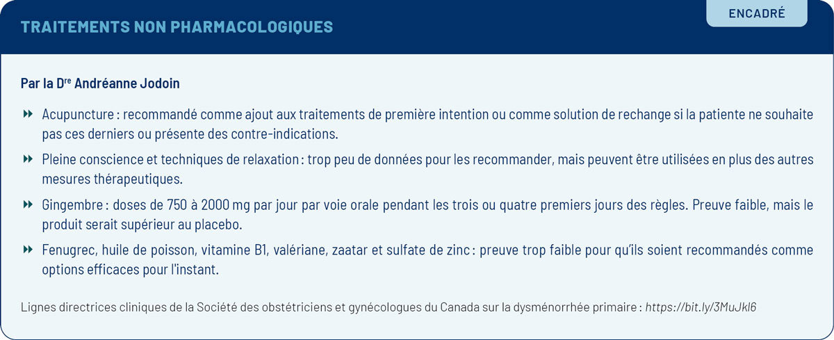 Les anti-inflammatoires constituent le traitement de première intention. « On recommande aux patientes de commencer à les prendre à intervalles réguliers dès qu’elles sentent qu’elles vont avoir leurs règles, avant même l’apparition des saignements. Si elles attendent que la douleur s’installe, ce sera ensuite très difficile de la faire diminuer », dit la Dre Jodoin.