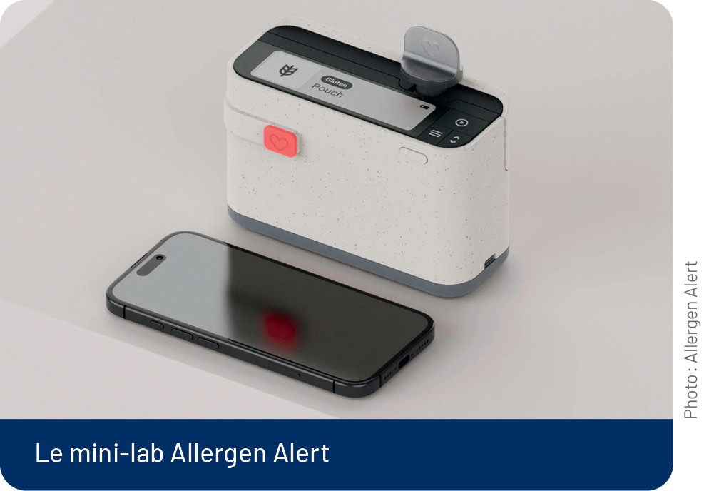 L’appareil – baptisé mini-lab – est fondé sur une technologie héritée de l’entreprise française de diagnostic in vitro bioMérieux. On insère la nourriture dans une petite pochette à usage unique, et l’appareil détecte la présence d’un allergène (seuil de détection de 5 parties par million) en deux minutes.