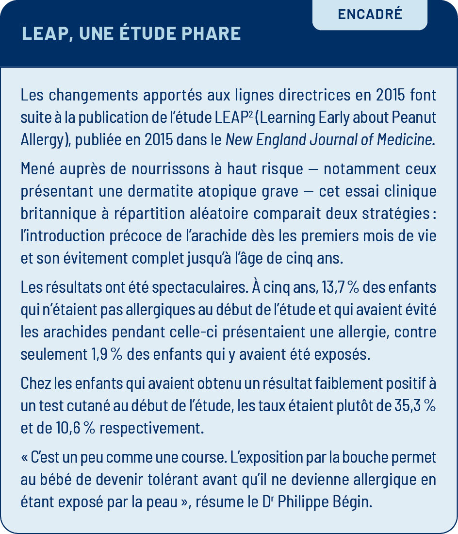 Pour bien comprendre cette étude, il faut la mettre en contexte. « En 2003, l’Académie américaine de pédiatrie avait émis une recommandation comme quoi il fallait repousser l’introduction des allergènes dans l’alimentation des bébés pour prévenir le développement d’allergies », rappelle le Dr Philippe Bégin. En théorie, l’idée pouvait se défendre. « Pour devenir allergique, il faut après tout être exposé à l’allergène », explique l’allergologue.