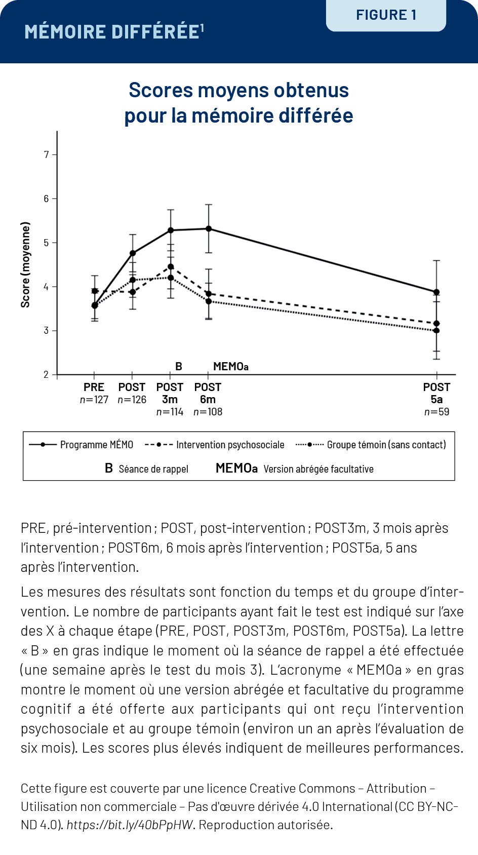 Dès le départ, les résultats sont intéressants. Immédiatement après l’intervention, et même six mois après, la mémoire différée des participants du groupe MÉMO est meilleure. Elle est aussi significativement supérieure à celle des deux autres groupes.