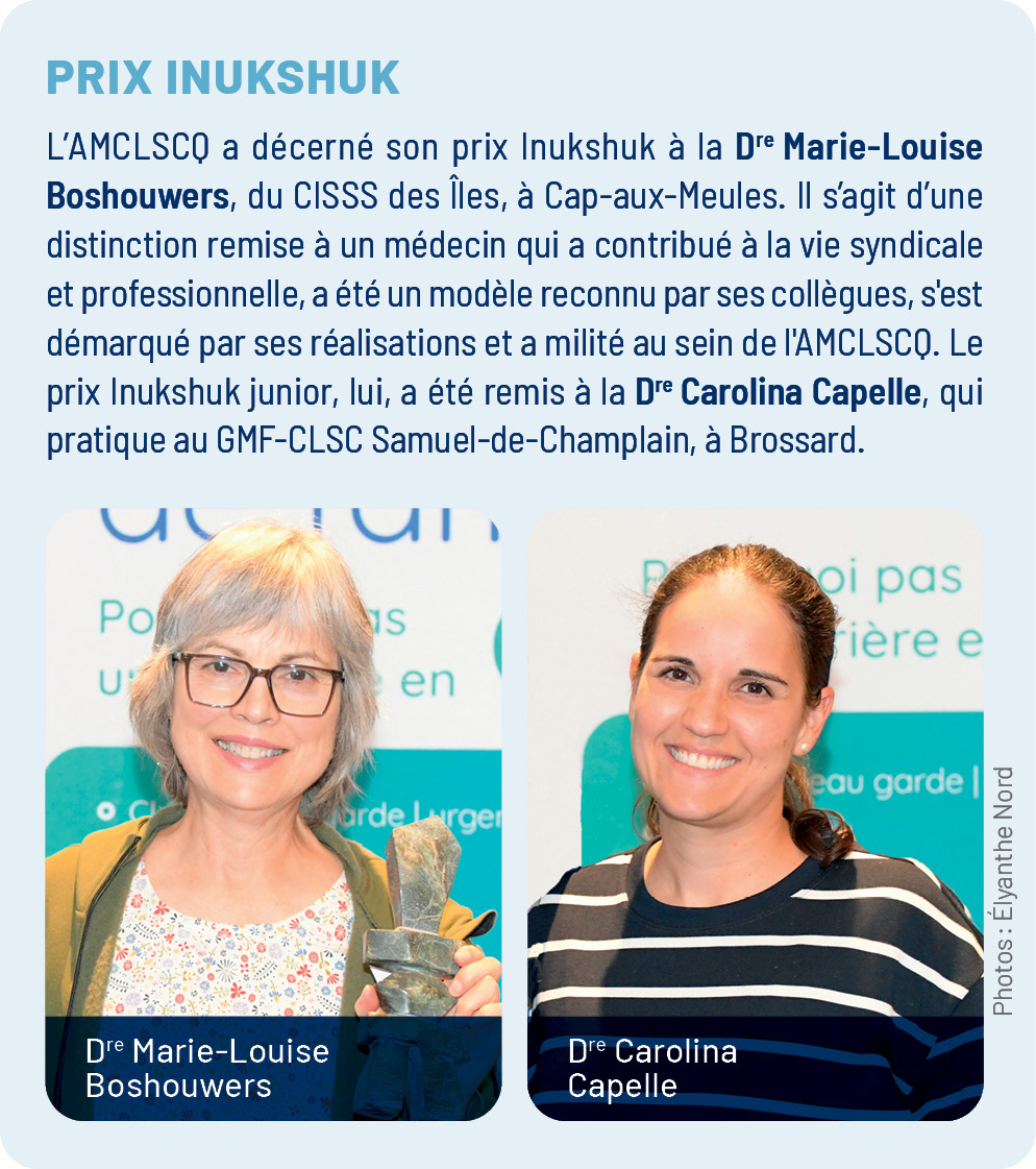 Les priorités de l’AMCLSCQ pour la prochaine année ? La reconnaissance de la pratique médicale en CLSC, l’amélioration du soutien à la pratique, la hausse du tarif horaire ainsi que la révision du mode de rémunération mixte pour les services courants.