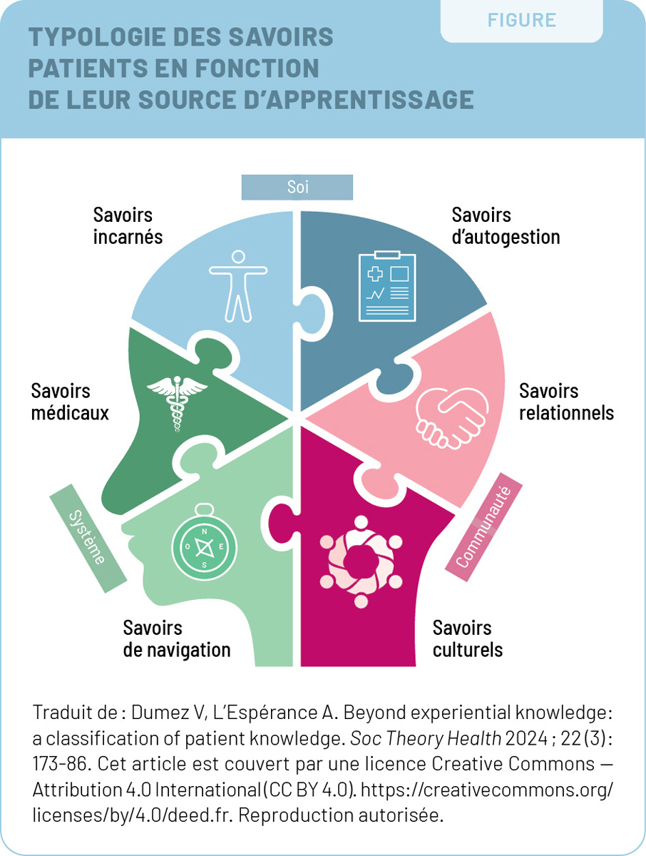 Des travaux récents de Dumez et L’Espérance3 ont permis de catégoriser les savoirs patients en six types : incarnés, d’autogestion, médicaux, de navigation, relationnels et culturels (figure3).