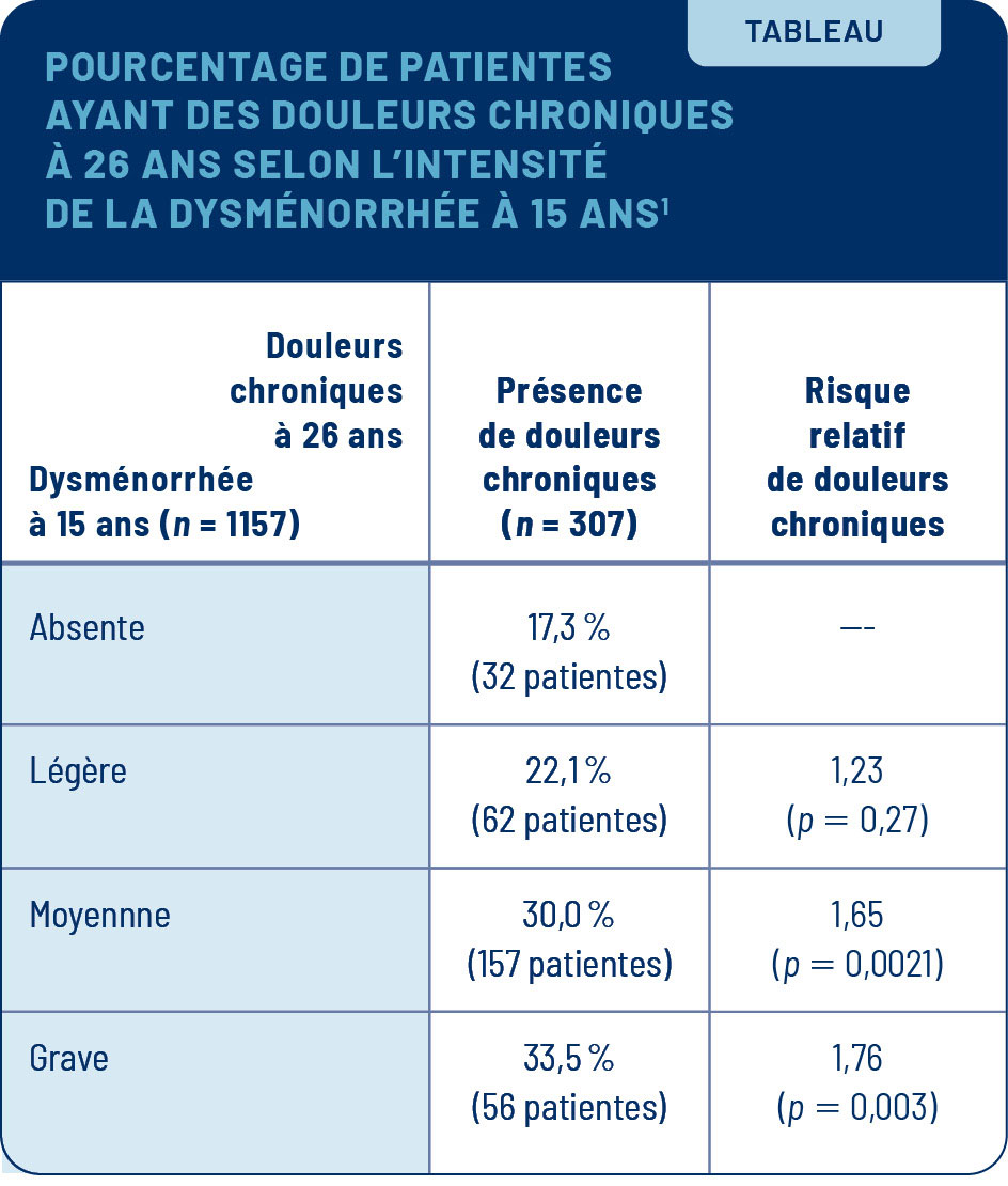 Le lien entre douleur chronique à l’âge adulte et douleur liée aux règles à l’adolescence s’est révélé croissant. Ainsi, parmi les 307 femmes touchées par des douleurs chroniques, 17 % n’avaient pas eu de dysménorrhée à 15 ans, 22 % en avaient eu de légères, 30 % de modérées et 34 % d’importantes (tableau). Les participantes qui avaient souffert de douleurs menstruelles importantes à 15 ans présentaient donc un risque accru de 76 % de douleurs chroniques à l’âge adulte et celles qui avaient éprouvé des douleurs modérées, un risque haussé de 65 %.