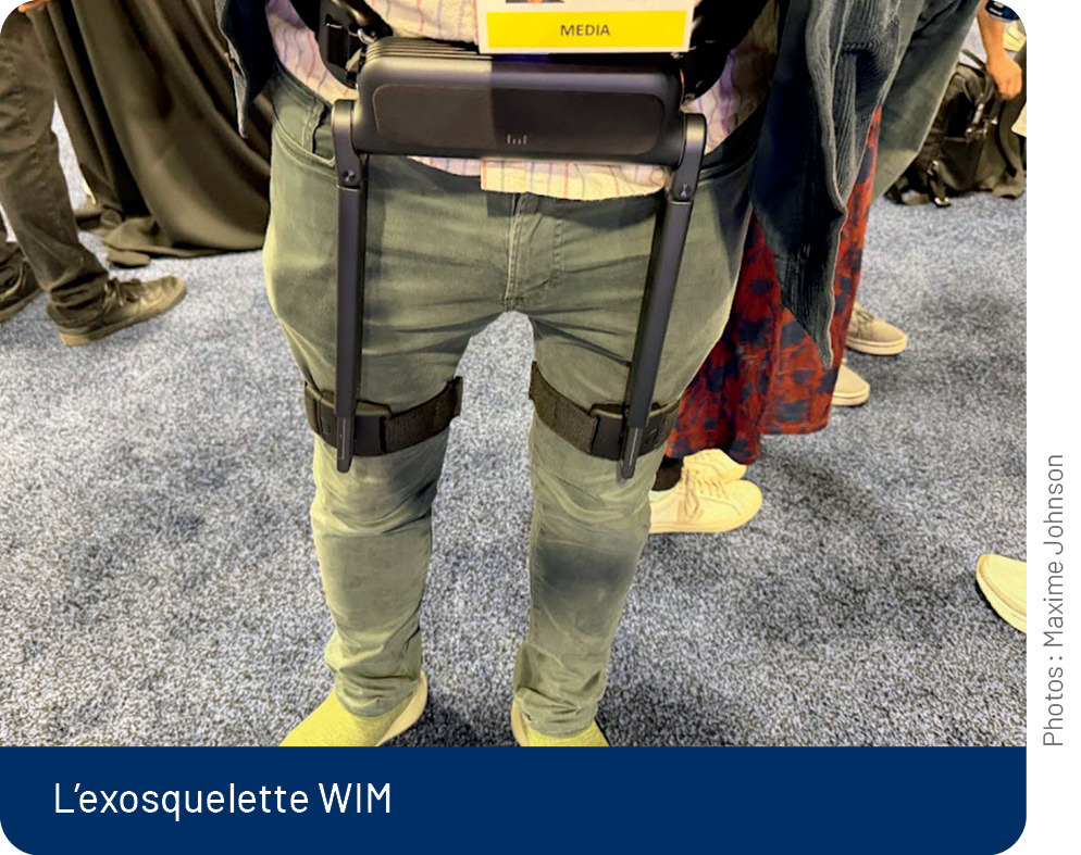 Le WIM du fabricant d’exosquelettes sud-coréen WIRobotics, par exemple, pèse 1,6 kg et tient dans une petite sacoche lorsqu’il est replié. En Europe, celui-ci est vendu environ 4000 $. Il se porte autour des hanches et des genoux, et devrait notamment permettre de marcher plus rapidement et avec une plus grande stabilité selon le fabricant.