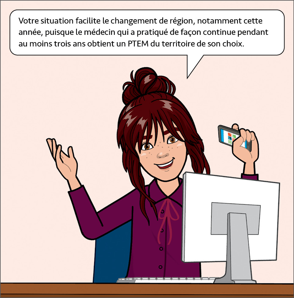Malgré l’obtention de l’avis de conformité au PTEM, le médecin devra toutefois s’assurer que la pratique visée est disponible dans le territoire convoité. Il est primordial que le médecin communique avec le département territorial de médecine familiale (DTMF) pour connaître les besoins de la région, les AMP disponibles et la possibilité d’obtenir un PEM, le cas échéant.