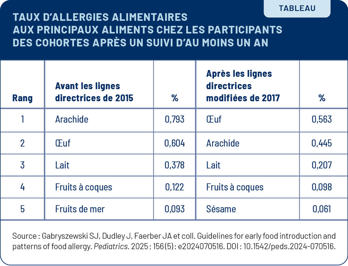 1. Gabryszewski SJ, Dudley J, Faerber JA et coll. Guidelines for early food introduction and patterns of food allergy. Pediatrics. 2025 ; 156 (5) : e2024070516. DOI : 10.1542/peds.2024-070516.